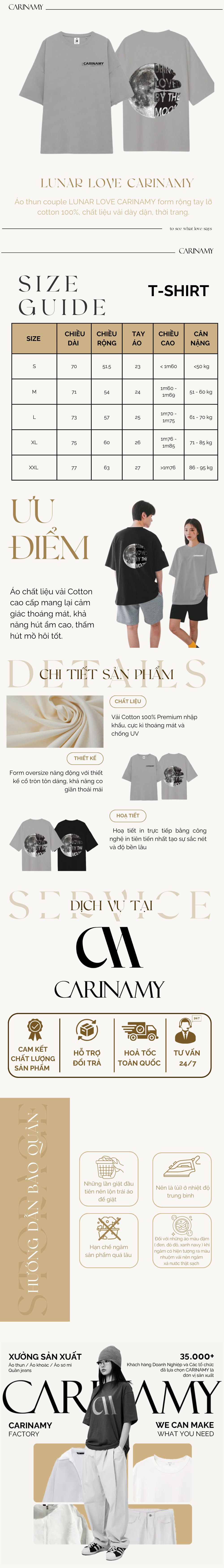 Áo thun couple form rộng LUNAR LOVE CARINAMY form rộng tay lỡ cotton 100%, chất liệu vải dày dặn, thời trang. LUNAR LOVE CARINAMY không chỉ là một sản phẩm thời trang đẹp mắt, mà còn mang trong mình ý nghĩa tình yêu sâu sắc và ý nghĩa về sự kết nối tình cảm giữa hai người. Như mặt trăng rực rỡ trên bầu trời đêm, biểu trưng cho sự lãng mạn, sự cân bằng và sự trường tồn, mẫu áo LUNAR LOVE là lời tuyên ngôn về tình yêu vượt thời gian và không gian, như ánh sáng của mặt trăng chiếu sáng suốt đêm dài. Với thiết kế độc đáo và ý nghĩa, nó là một cách tuyệt vời để thể hiện tình yêu và sự quan tâm trong mối quan hệ.