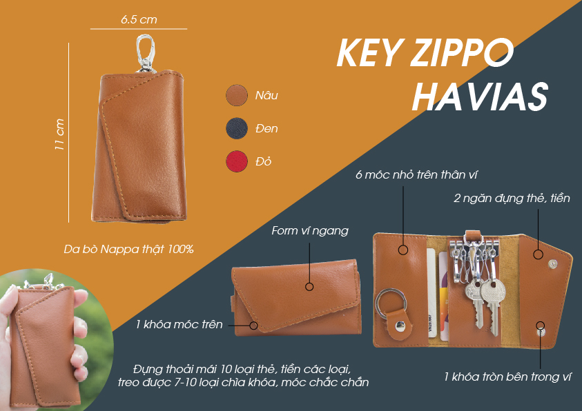 Một hộp đựng chìa khóa chất lượng từ HAVIAS được làm bằng da mềm sang trọng. Thiết kế tiện lợi gồm 6 clip riêng lẻ, kèm phần có khóa kéo để thay đổi. Là một vật dụng gọn gàng, cần thiết để bỏ túi. Key Zippo có khóa đôi để tùy ý điều chỉnh độ chặt. Phần đính kèm vòng chìa khóa phù hợp với các chìa khóa dài mới. Bảo đảm giữ tất cả chìa khóa của bạn một cách an toàn trong túi da mềm, đồng thời bảo da bên trong túi của bạn. Bao da còn có khóa kéo bên trong dùng để đựng tiền, thẻ đậu xe, thẻ atm, ...