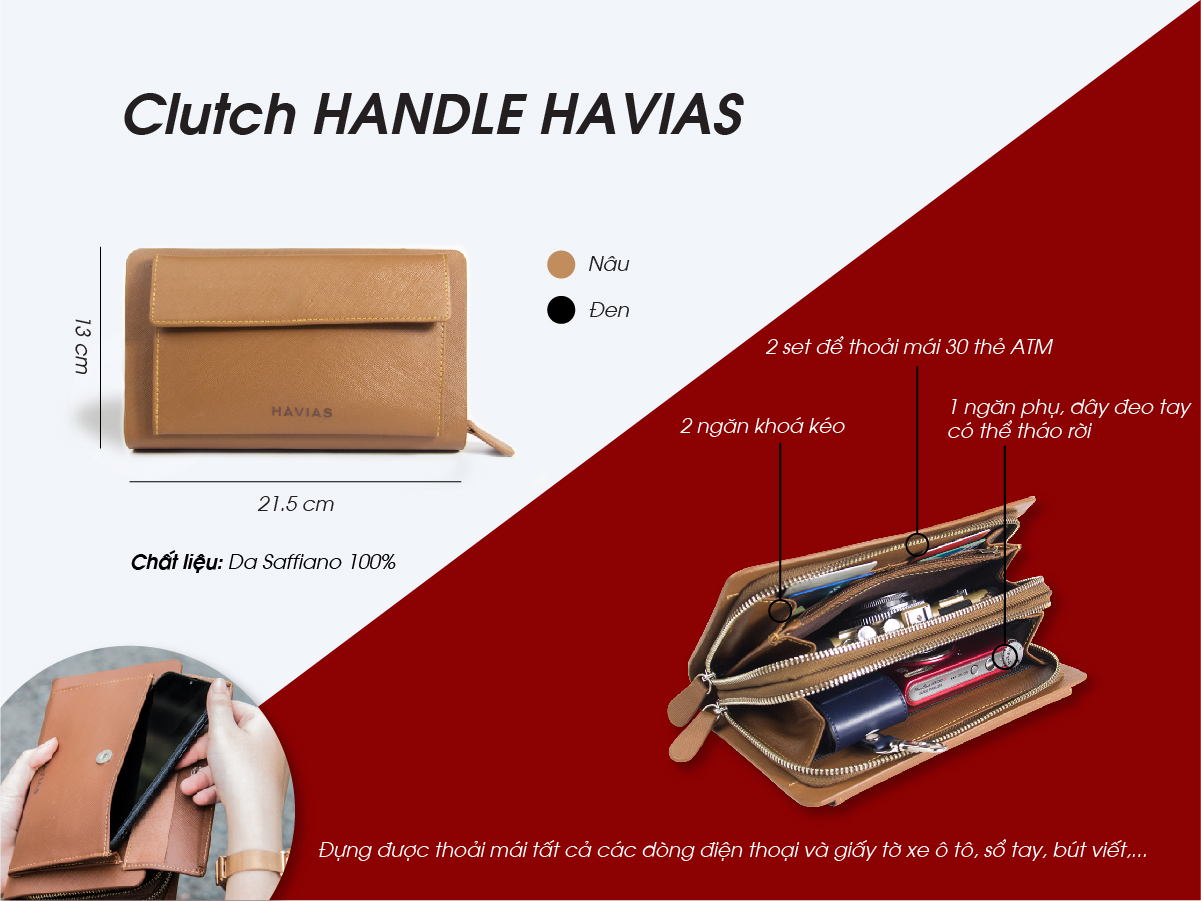 Clutch xuất hiện từ những năm 1950, chủ yếu được giới quý tộc dùng trong những bữa tiệc xa hoa. Và dạng Clutch cầm tay 2 khoá kéo Handle HAVIAS là một trong những form dáng điển hình cho sự đơn giản giúp bạn có thể sử dụng ở mọi nơi, từ những bửa tiệc cho đến một cuộc dạo phố. Sản phẩm sử dụng dòng da Saffiano cao cấp nhập khẩu từ Ý 100% (chống trầy và thấm nước). Với thiết kế 2 khóa kéo chắn chắc, bên trong mỗi ngăn kéo có 2 ngăn để tiền rộng rãi cùng với đó là ngăn để thẻ ATM và nhiều loại thẻ khác. Bên cạnh đó HAVIAS còn trang bị thêm một đai cầm tay có thể xách ngang hoặc cầm theo chiều túi tạo cảm giác an toàn khi sử dụng.