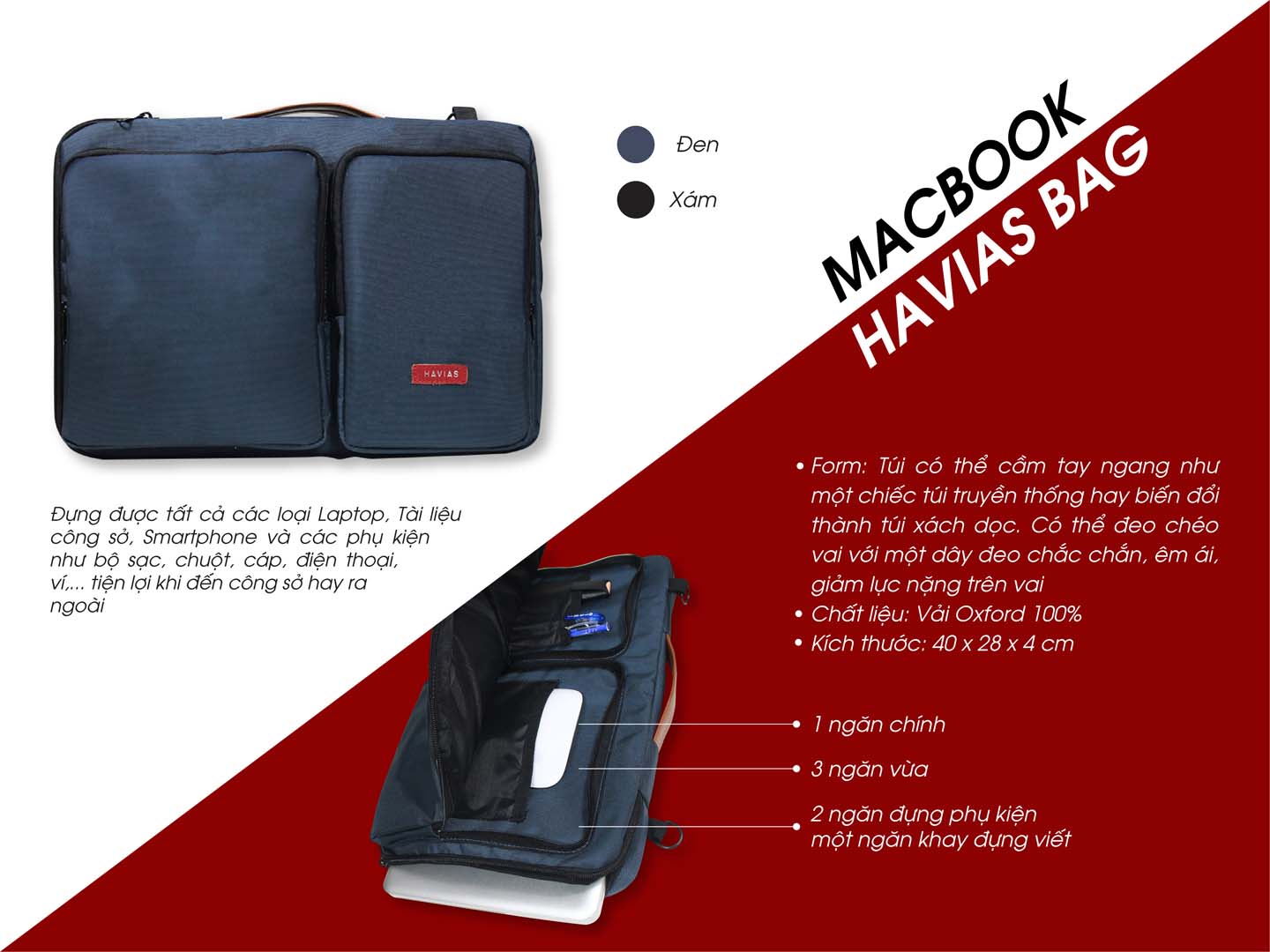 Cặp xách HAVIAS MAC Oxford nhỏ gọn, sang trọng và tiện dụng được làm từ vải Oxford nhẹ, dày dặn, chống thấm tốt, không mùi và vô cùng bền bỉ chính là sự thay thế hoàn hảo cho những chiếc balo to nặng, cồng kềnh.