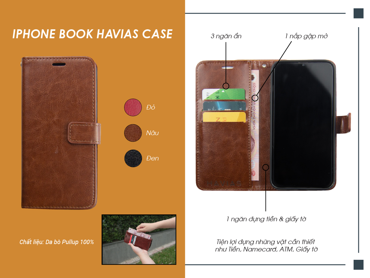 Case ốp da điện thoại iPhone HAVIAS Book với thiết kế từ da Bò Pullup thật 100%, mang lại trải nghiệm tốt nhất dành cho người dùng mà vẫn đáp ứng đầy đủ các tính năng bảo vệ và làm đẹp thêm cho chiếc iPhone. Phần nắp gập mở cho thao tác lấy điện thoại dễ dàng như quyển sổ tay nhỏ cầm tay, các góc cạnh được may bo tròn ôm sát sản phẩm để tránh va đập. Bên trong được tích hợp thêm 3 ngăn thẻ và 1 ngăn lớn ẩn có thể dùng để đựng những vật cần thiết như Tiền, Namecard, ATM, Giấy tờ,... vừa tiện dụng, vừa hiện đại, lại được đảm bảo chất lượng từ HAVIAS. Mua đi chờ chi !