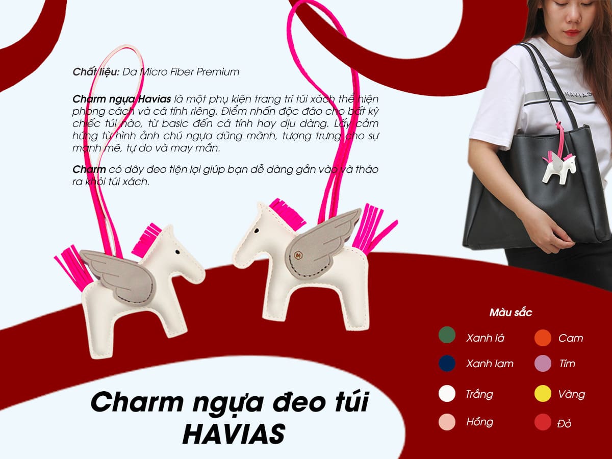 Havias bag horse charm is a handbag decoration accessory that helps you express your own style and personality. With a simple but sophisticated design and eye-catching color combination, the Havias horse charm will be a unique highlight for any bag, from basic to stylish or gentle. Havias horse charm is inspired by the image of a mighty horse, symbolizing strength, freedom and luck. High quality material made from Micro Fiber Premium leather, soft and durable, bringing a luxurious feeling when used. The charm has a convenient strap that makes it easy to attach and remove from your bag.