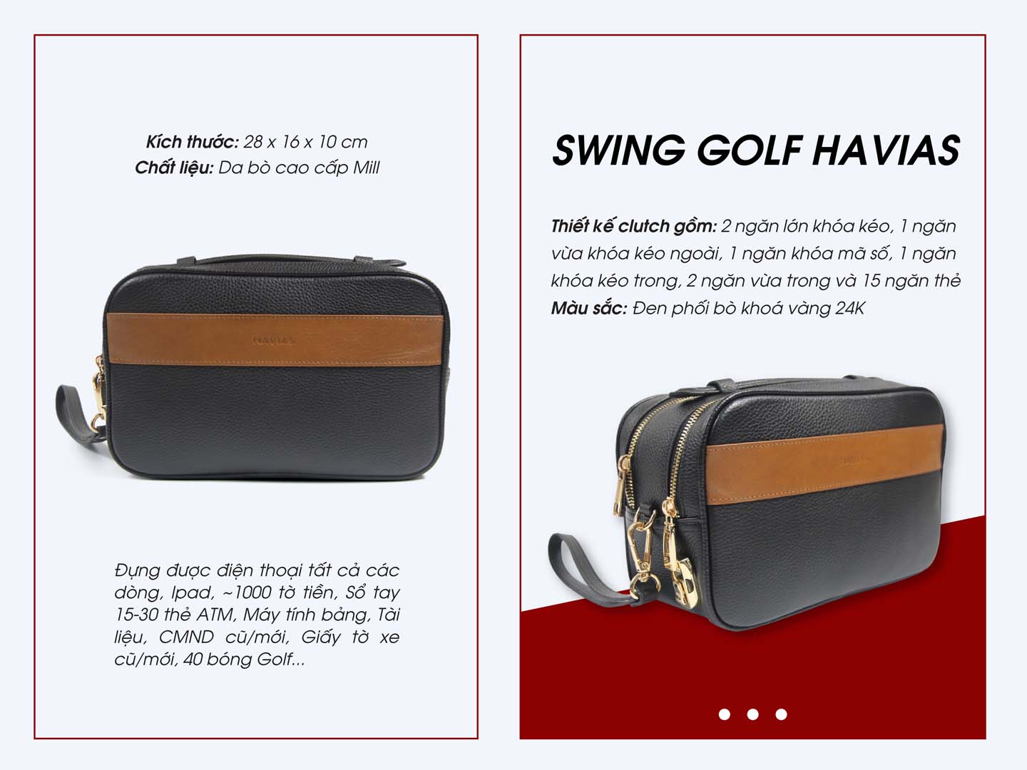 Túi Clutch 2 khoá mã số SWING Golf HAVIAS nổi bật với thiết kế hiện đại, sang trọng. Chất da bò cao cấp Mill Premium xa xỉ thượng hàng dành cho giới thượng lưu, kết hợp cùng khóa mã sổ cao cấp đặc biệt và dây kéo mạ vàng 24K ion 3 lớp và làm cho chiếc túi có một diện mạo vô cùng hoàn hảo.