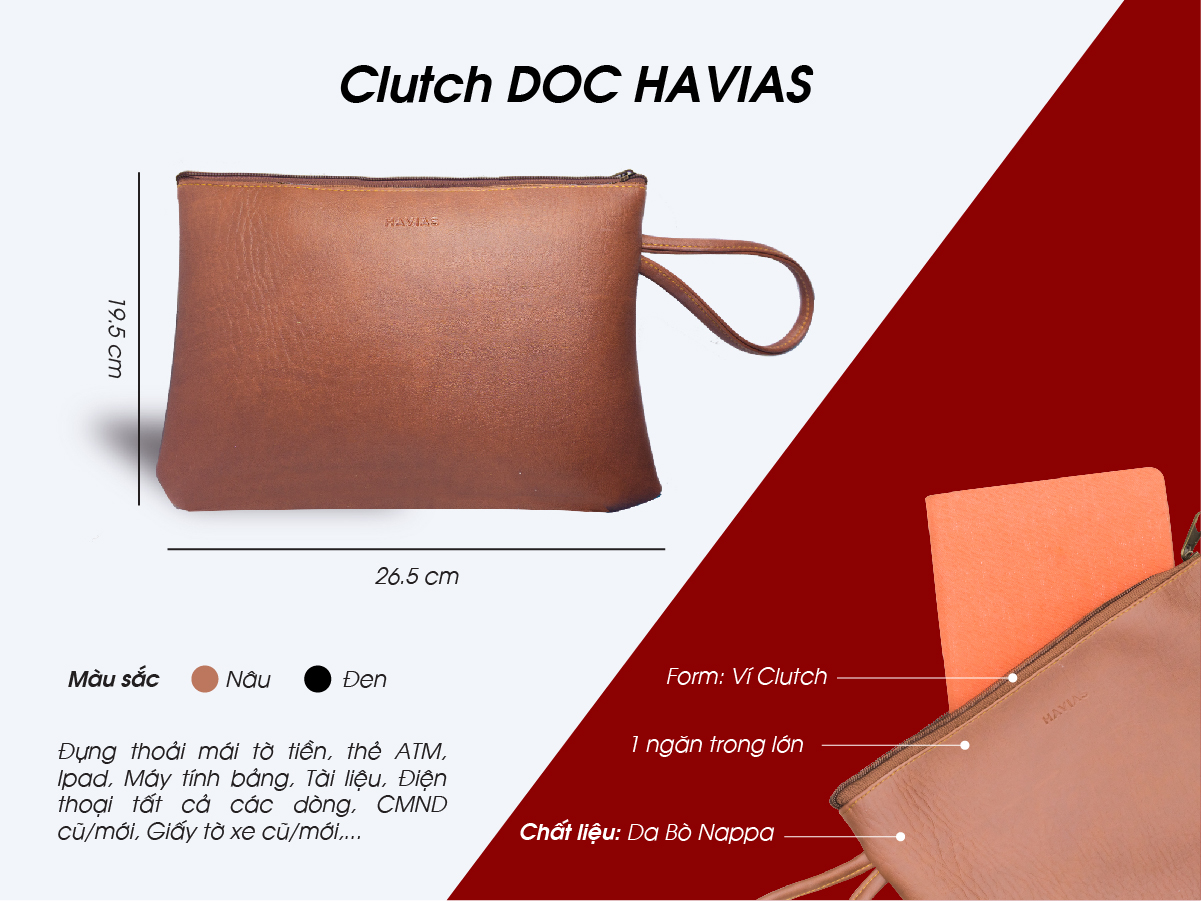 Bạn đang cần tìm một chiếc phụ kiện thời trang sang trọng nhưng vẫn tiện lợi, đựng được nhiều thứ giúp người sử dụng dễ dàng di chuyển trong mọi hoàn cảnh. Túi Clutch Da cầm tay DOC do HAVIAS sản xuất chắc chắn sẽ là item không thể nào phù hợp hơn. Với chắc da Nappa cực đẹp, kèm them quai móc, khóa zip chắc chắn.