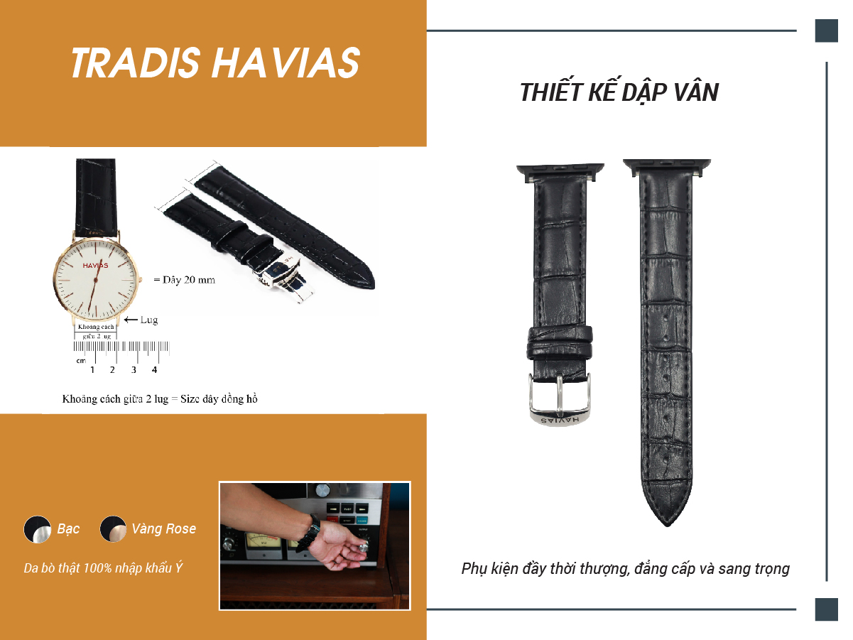 Basic always be Classy. Cổ điển, đơn giản nhưng vẫn đầy thời thượng, đẳng cấp và sang trọng, dây đồng hồ HAVIAS Tradis chính là phụ kiện mà ai cũng cần phải có. Chế tác từ dòng da bò cao cấp nhập khẩu, dây đồng hồ Tradis vừa bền bỉ, không biến dạng theo thời gian mà khi sử dụng lâu lại càng mềm và đẹp hơn.