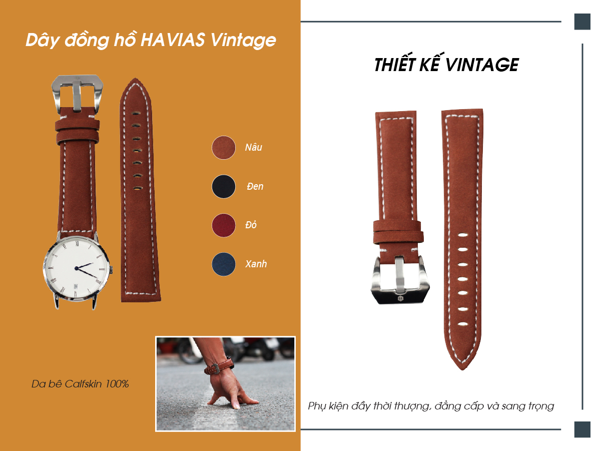 Dây đồng hồ HAVIAS Vintage thiết kế cổ điển với vân chỉ nổi được may thủ công tỉ mỉ từ chất liệu da bê Calfskin nhập khẩu. Dây đồng HAVIAS Vintage có đến 4 màu unisex trendy khiến bạn phải muốn đủ cả 4 items dây đồng hồ này.