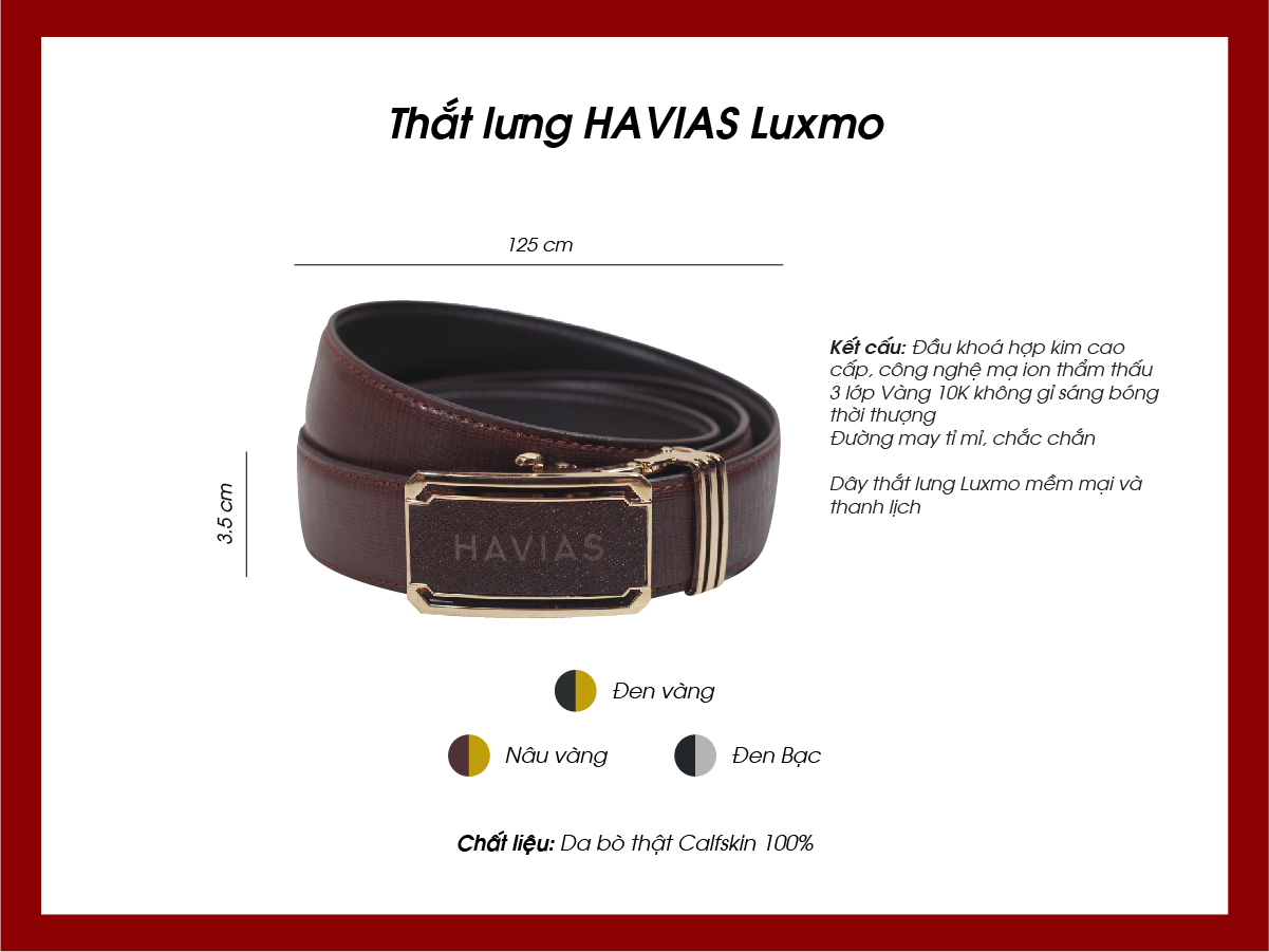 Thắt lưng cao cấp HAVIAS Luxmo sử dụng chất liệu da bò thật cao cấp nên vô cùng bề bỉ theo thời gian. Khi sử dụng thắt lưng cao cấp Luxmo của HAVIAS, sau một thời gian thắt lưng không bị biến dạng mà còn trở nên mềm mại và thanh lịch hơn. Với thiết kế tối giản nhưng tinh tế, thắt lưng da thật HAVIAS Luxmo phù hợp với tất cả các dạng trang phục từ đồ công sở, đồ đi chơi, đi tiệc hoặc đơn giản là basic wear hằng ngày.