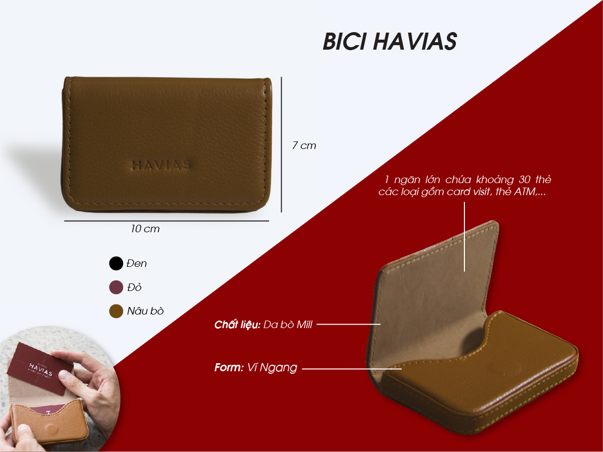 Hộp ví card da bò BICI HAVIAS với thiết kế nhỏ gọn, sang trọng cùng chất liệu vô cùng bền bỉ hứa hẹn sẽ mang đến cho khách hàng một trải nghiệm khó quên. Sản phẩm được làm từ da bò MIll - loại da được nhiều người ưa chuộng và được sử dụng rộng rãi nhờ cấu trúc tự nhiên trên nền da cùng vẻ đẹp hoang dã của nó chắc chắn sẽ chinh phục được nhiều khách hàng khó tính. Da sáp Mill có hiệu ứng “lên nước” rất rõ, vì da có độ nhám cao, dễ trầy. Do đó để lại nhiều vệt, sau khi lên nước sẽ bóng hơn, nhìn sẽ giống như đồ cổ. Đặc biệt thiết kế thông minh của hộp ví vô cùng tiện lợi, chỉ cần mở nhẹ là có thể dễ dàng lấy ra sản phẩm bên trong. Sức chứa của nó lên đến 20 chiếc thẻ bao gồm card visit, thẻ ngân hàng cùng nhiều loại thẻ khác.