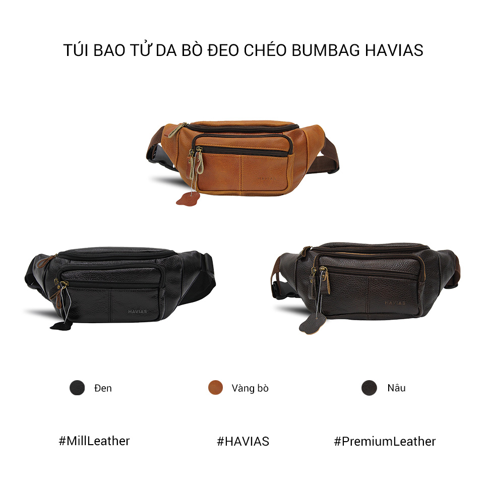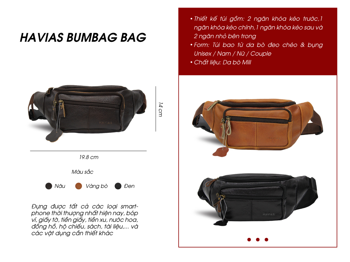 Túi bao tử da bò đeo chéo & bụng Bumbag HAVIAS là một trong những thiết kế của nhà HAVIAS mang dáng vẻ đơn giản nhưng lại vô cùng tinh tế, năng động và hiện đại. Với thiết kế nhỏ gọn, nó có thể chứa được những vật dụng cần thiết của bạn. Khoác lên mình lớp da bò Mill, HAVIAS tin chắc bạn sẽ không hối hận khi sở hữu nó. Vì điểm ấn tượng của chất da Mill chính là việc giữ nguyên các cấu trúc tự nhiên trên nền da. Việc không qua công nghệ dập vân, các vết sẹo, côn trùng cắn tạo nên lớp chất liệu sở hữu vẻ đẹp hoang dã với các chỗ có hột, chỗ không, nơi có đường vân, nơi trơn nhẵn. Tất cả tạo nên sự khác biệt cực kỳ thu hút. Bên cạnh đó, da sáp Mill có hiệu ứng “lên nước” rất rõ, vì da có độ nhám cao, dễ trầy. Do đó để lại nhiều vệt, sau khi lên nước sẽ bóng hơn, nhìn sẽ giống như đồ cổ.
