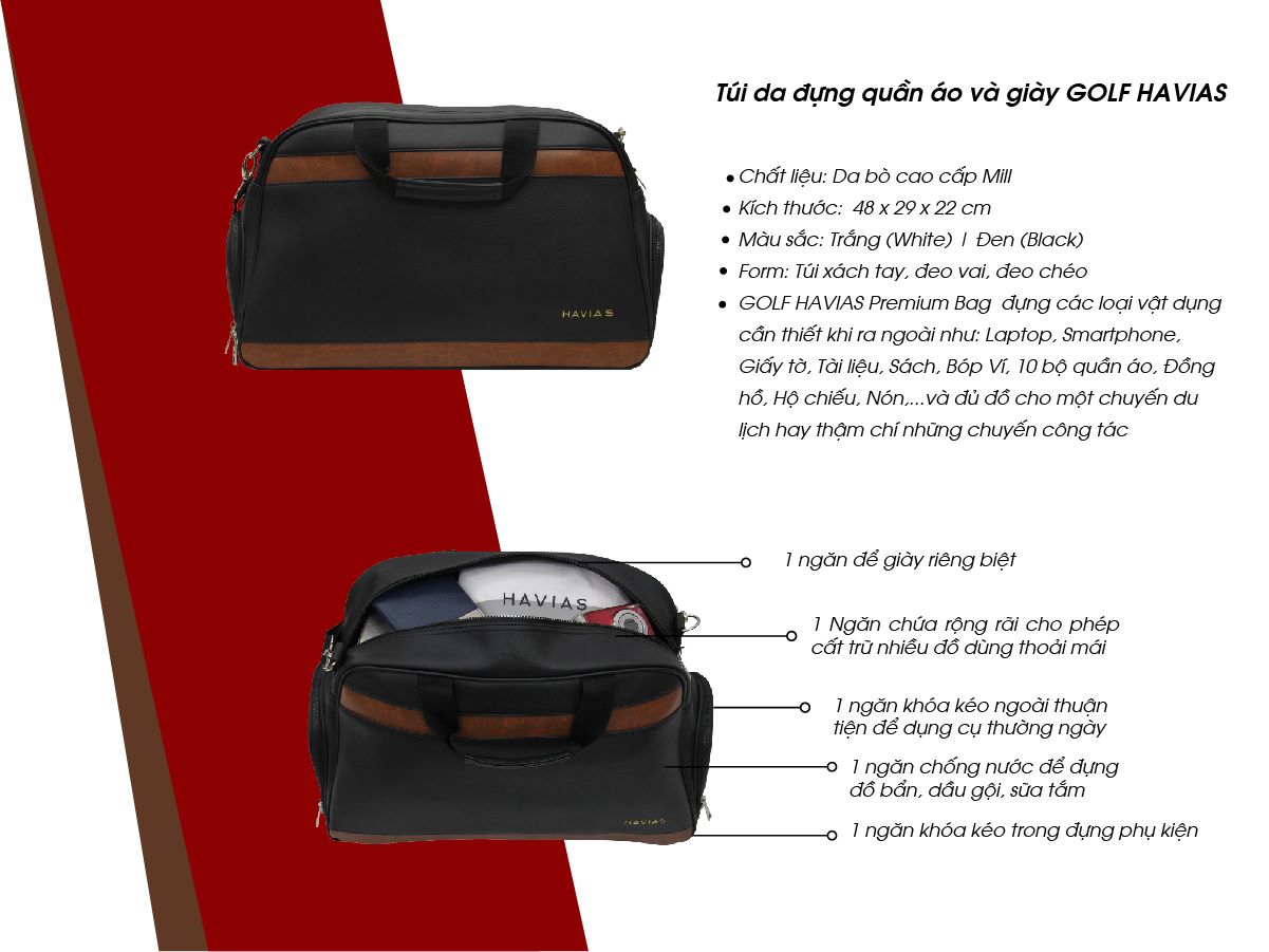 Leather bag for clothes and shoes GOLF HAVIAS Premium Bag is made from Mill cowhide, suitable for storing clothes, shoes and other necessary items. A high-quality leather bag that cannot be missed by those who love a sporty, active style and like to travel around the world. The main compartment is spacious and can hold a lot of clothes and shoes. Separate shoe compartment helps keep shoes from getting dirty or wet. In addition, there are also small additional compartments to store other personal items such as phones, wallets, keys, etc. GOLF HAVIAS Premium Bag leather bag for clothes and shoes is designed with sturdy handles, with Detachable for convenient carrying. In addition, the bag also has a crossbody strap so you can carry it comfortably. GOLF HAVIAS Premium Bag promises to become the owner's close friend when going to the gym, or traveling for up to 8 days with friends, or even on week-long business trips.