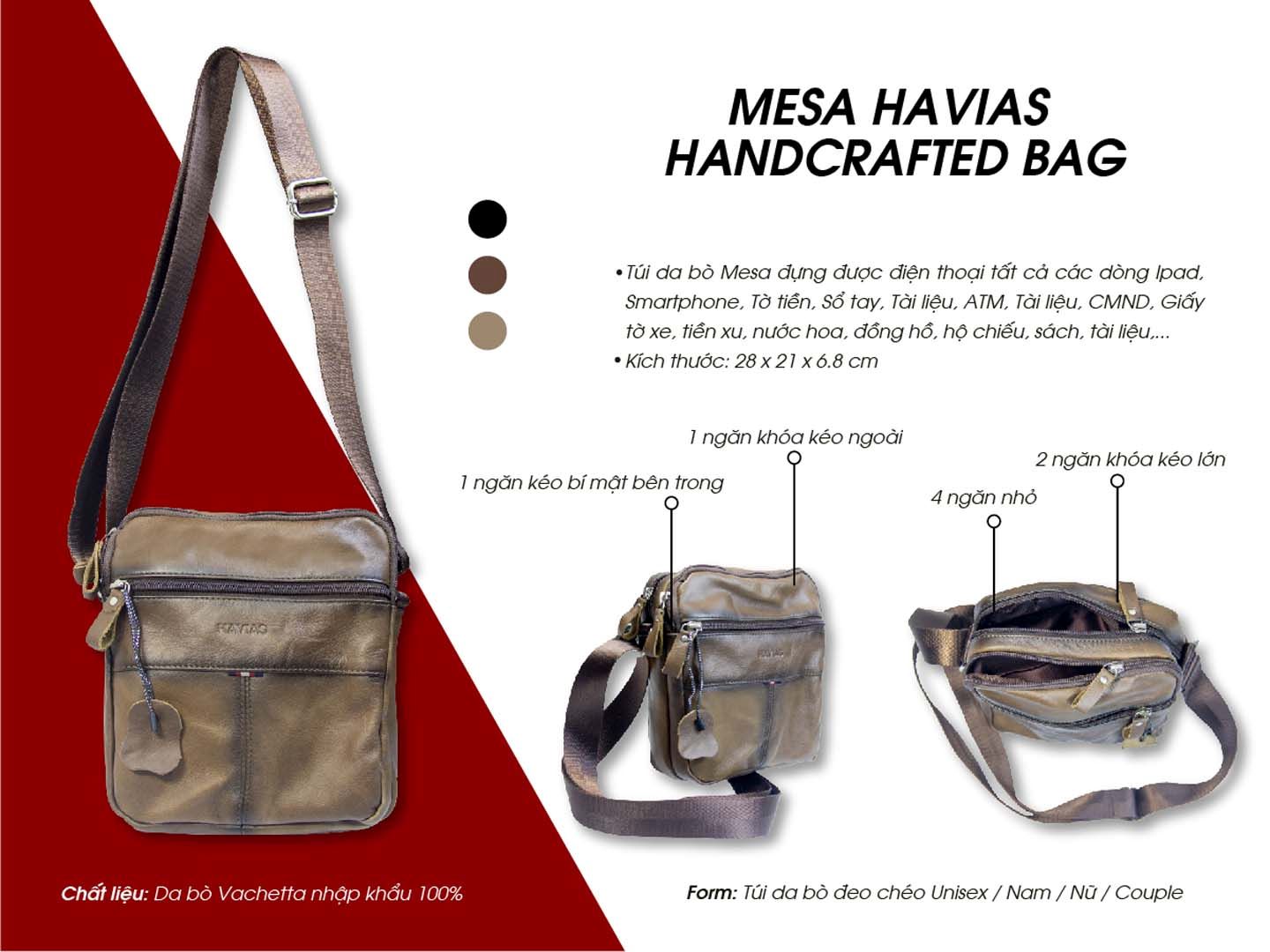 Mesa HAVIAS cowhide cross leather - A simple design but extremely delicate, luxurious, dynamic and modern. As a great travel companion, it can hold your essentials. With Vachetta Cowhide, high quality and solid, the delicate and meticulous seams will create a different class for anyone who owns it.