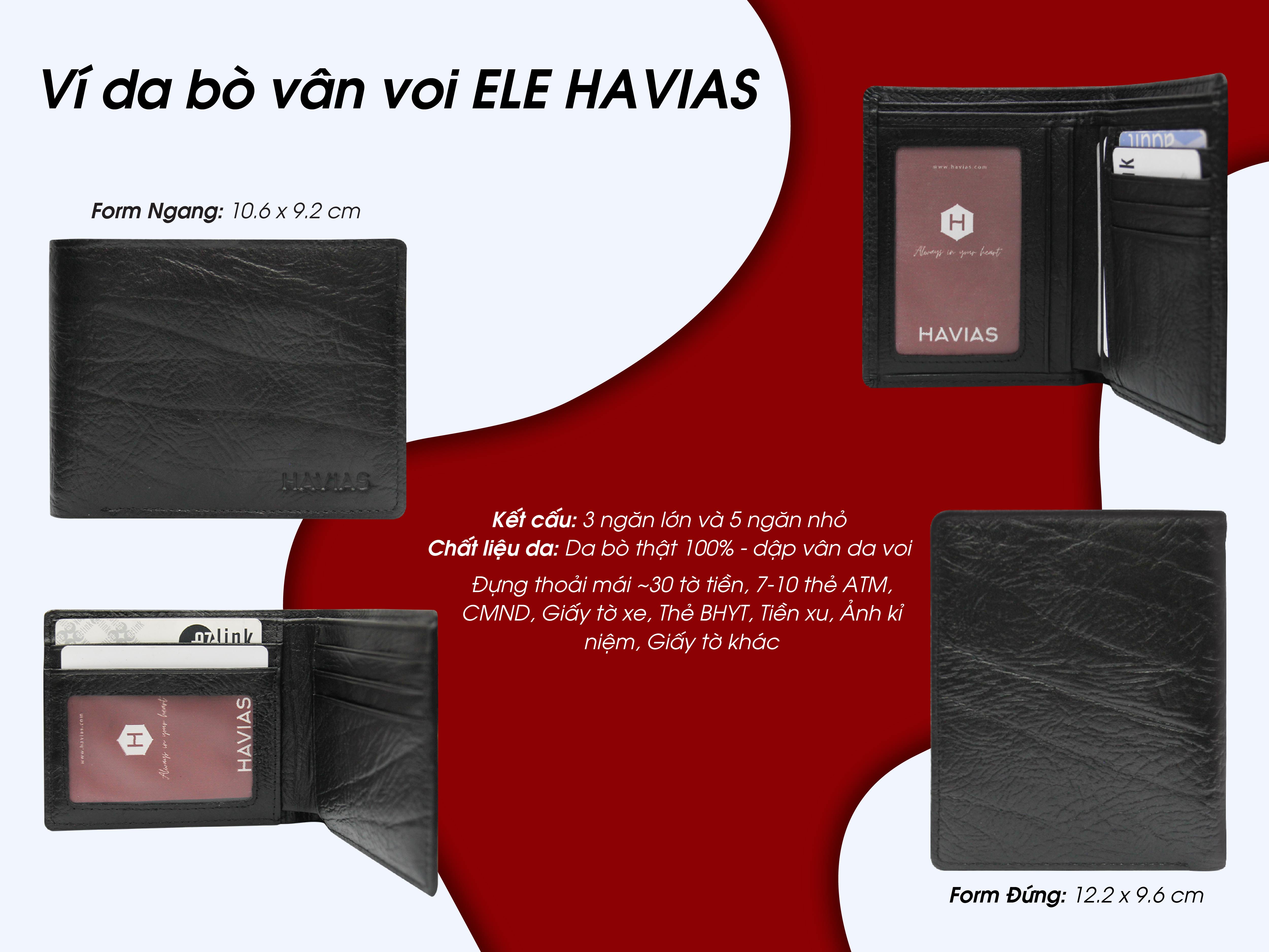 Bạn đang tìm kiếm một chiếc ví da sang trọng và đẳng cấp? Ví da bò vân voi ELE HAVIAS chính là sự lựa chọn hoàn hảo dành cho bạn. Được làm từ chất liệu da bò thật 100% với những đường vân voi độc đáo, ELE HAVIAS mang đến cho bạn sự sang trọng và đẳng cấp khó cưỡng. Thiết kế tinh tế, tỉ mỉ từng đường may thể hiện sự cao cấp của sản phẩm. Kích thước nhỏ gọn, tiện lợi giúp bạn dễ dàng mang theo bên mình mọi lúc mọi nơi.