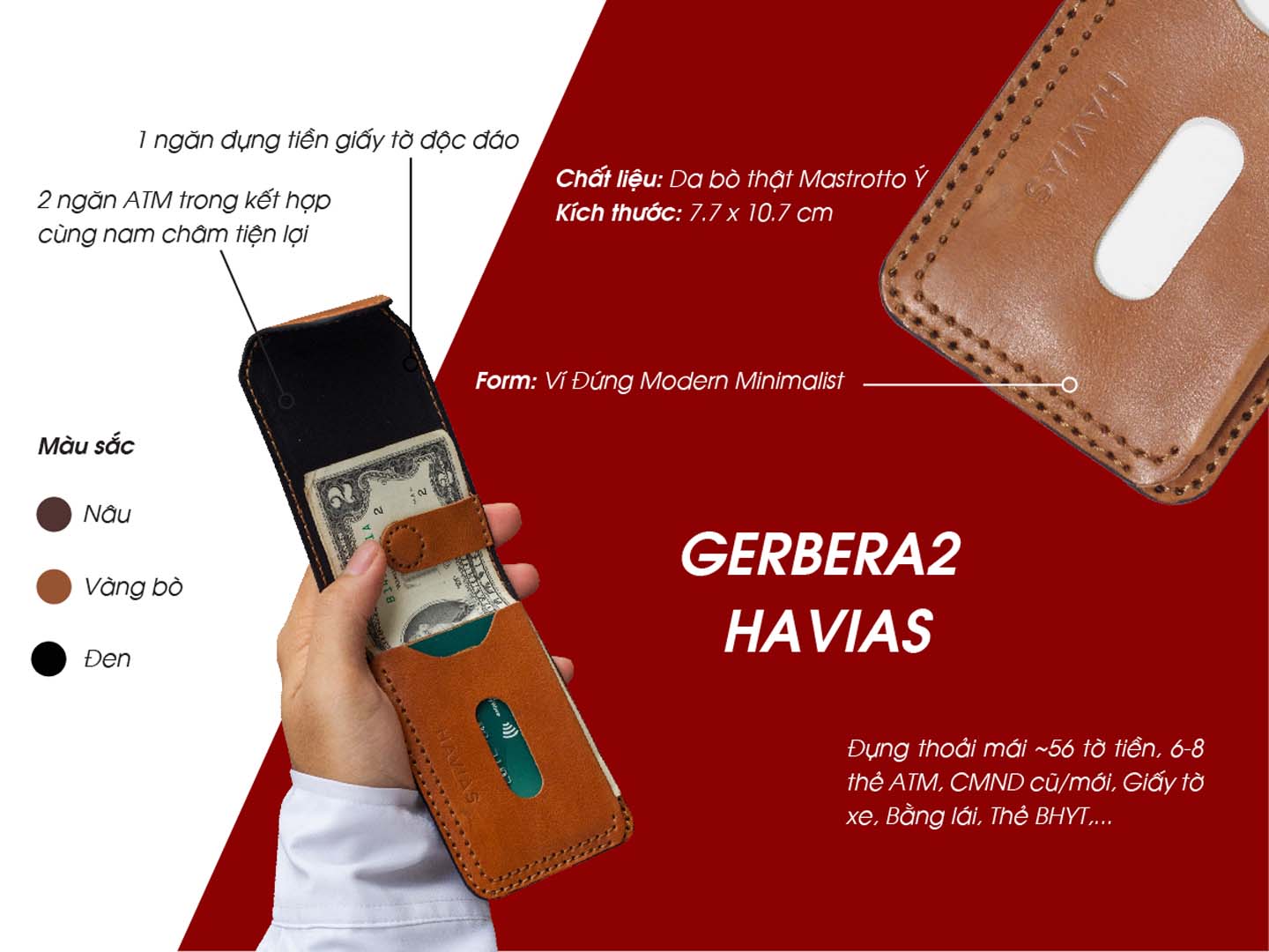 Ví da Gerbera2 chính là phiên bản nâng cấp tốt hơn của ví da nam Gerbera phiên bản cũ. Được thay đổi từ dòng ví da được làm từ chất liệu Shell Cordovan thành chất liệu da bò thật Mastrotto Ý, ví da bò Gerbera2 được khoác một vẻ ngoài hiện đại và năng đông hơn so với dòng ví cũ. Chỉ giữ lại thiết kế cơ bản của dòng ví Gerbera cũ, Gerbera2 đã gần như lột xác hoàn toàn từ cách phối màu đến nâng cấp những tiện ích thông minh và thay đổi dáng ví cho trở nên phù hợp hơn với thời đại.