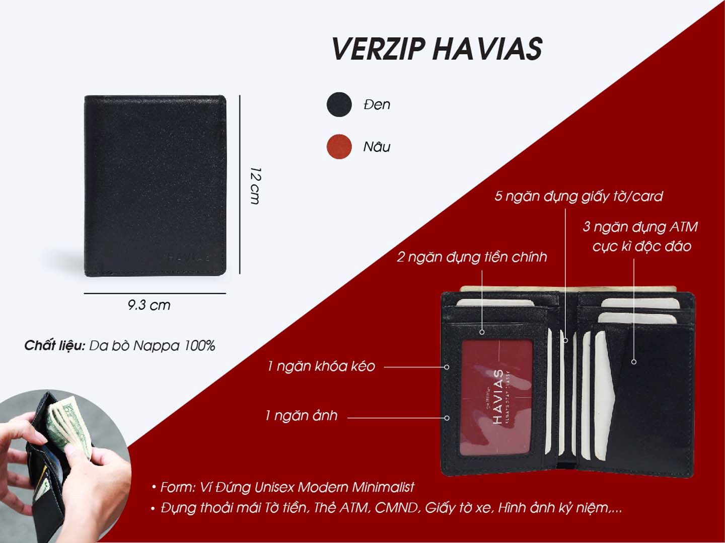 Mẫu ví Verzip Handcrafted Wallet đa chinh phục những khách hàng khó tính nhất của HAVIAS với chất liệu da bò Nappa cao cấp nhập khẩu và khả năng chống trầy, chống thấm nước. Với thiết kế hoa mỹ, mang đậm hơi hướng hiện đại, kết hợp cùng ngăn thẻ được thiết kế vô cùng độc đáo bởi bộ phận R&D HAVIAS đã tạo cảm giác cực kì sang trọng cho chiếc ví. Verzip đang dần khẳng định vị thế "kẻ nổi loạn" khi liên tục đứng đầu trong các bảng xếp hạng Best Seller nhà HAVIAS.
