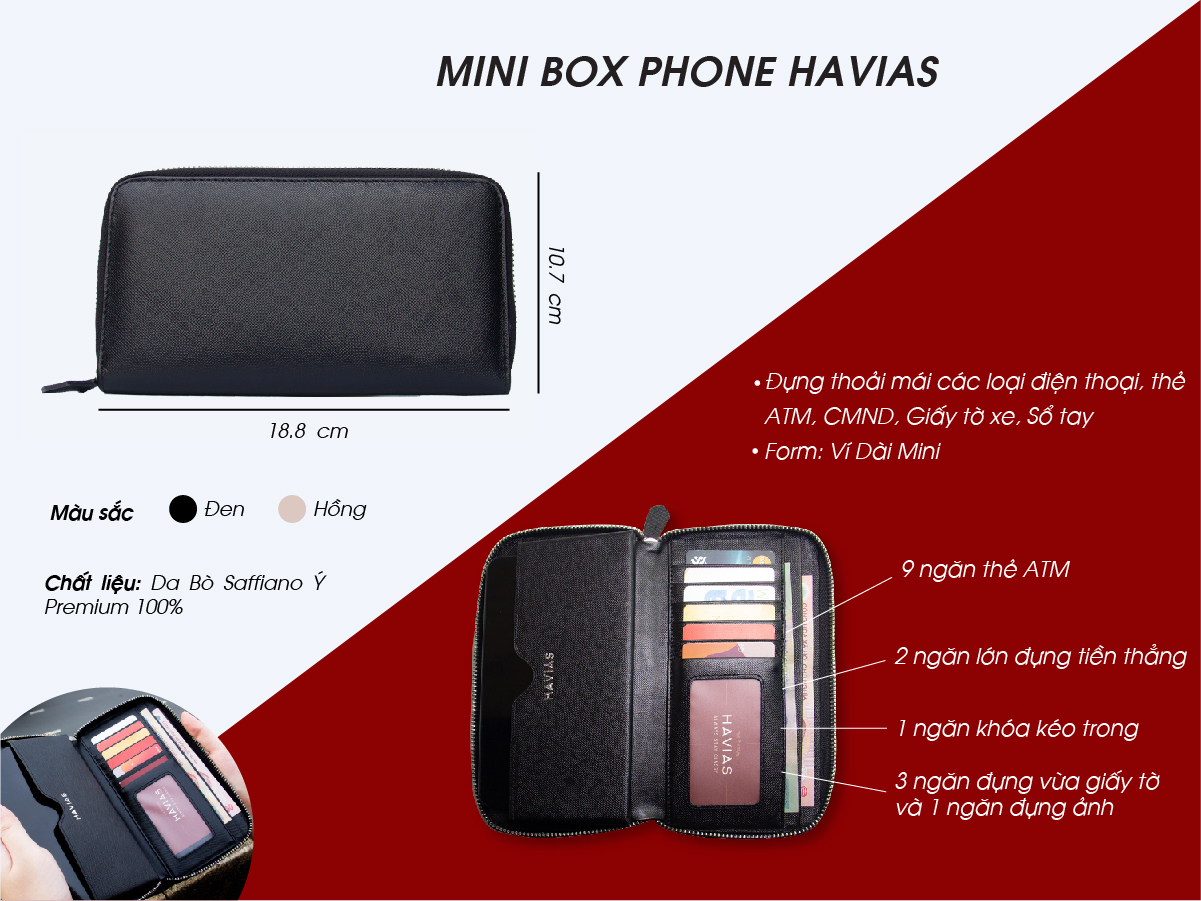 Mini BOX HAVIAS Mini Long Wallet is a new product from the All In One series, which holds everything in one wallet. The product is extremely sophisticated and meticulously handcrafted from 100% genuine Italian Saffiano Premium cowhide. HAVIAS BOX ensures convenience and peace of mind for customers by the number of compartments (over 3 large compartments and more than 5 card slots, ...). You can hold most of today's latest phones, cards, cash, papers, no longer have to worry about forgetting things or spending time looking for a certain type of paper. Especially, Mini BOX HAVIAS has a very convenient box-shaped wallet compartment. BOX HAVIAS is really a good assistant when you need to go out shopping or travel with friends, ...