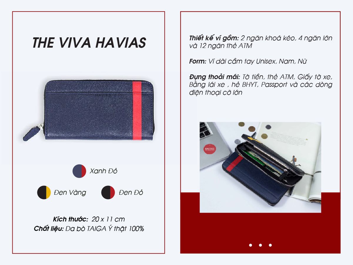 Mẫu ví dài có khóa kéo nằm trong bộ sưu tập The Viva của HAVIAS, sử dụng dòng da TAIGA nhập khẩu giúp chống trầy và chống thấm nước cùng với khoá kéo nhập khẩu cao cấp khẳng định đẳng cấp qua từng chuyển động. Bên trong sử dụng lớp lót, tạo form ví vuông vắn mà vẫn giữ được sự mềm mại của da (có thẻ bẻ cong ví, ví vẫn chở lại form bình thường mà không sợ gãy ví).