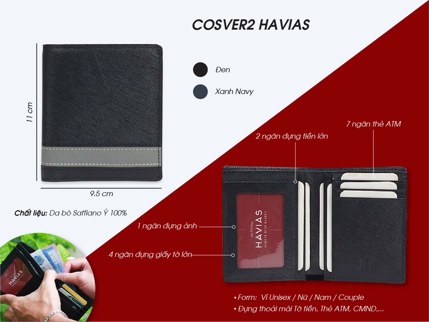 Ví đứng Cosver2 HAVIAS Handcrafted Wallet là dòng ví da đứng lấy chất liệu và thiết kế từ mẫu Cosmo2 thần thánh của HAVIAS. Giữ nguyên chất liệu da bò thật Saffiano cao cấp cùng kiểu dáng basic đơn giản nhưng tinh tế và thời thượng, Cosver2 chính là lựa chọn cho các bạn thích dạng ví đứng nhỏ gọn nhưng vẫn mạnh mẽ, cá tính như mẫu Cosmo2.