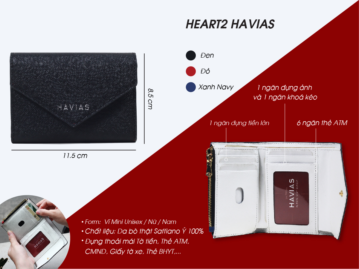 Dáng ví Mini nhỏ gọn chưa bao giờ là lỗi mốt vì chính sự tiện lợi và tinh tế của nó. Sau Heart3 được rất nhiều khách hàng ưa chuộng, bộ phận R&D HAVIAS đã thiết kế và cho ra đời Heart2 như một phiên bản cải tiến hơn của sản phẩm trước. Giữ nguyên kích thước nhỏ gọn nhưng đựng được rất nhiều các vật dụng cần thiết, Heart2 khác biệt khi sở hữu khóa kéo kín đáo bên trong ví cùng với thiết kế nắp gập hình bìa thư cách điệu.