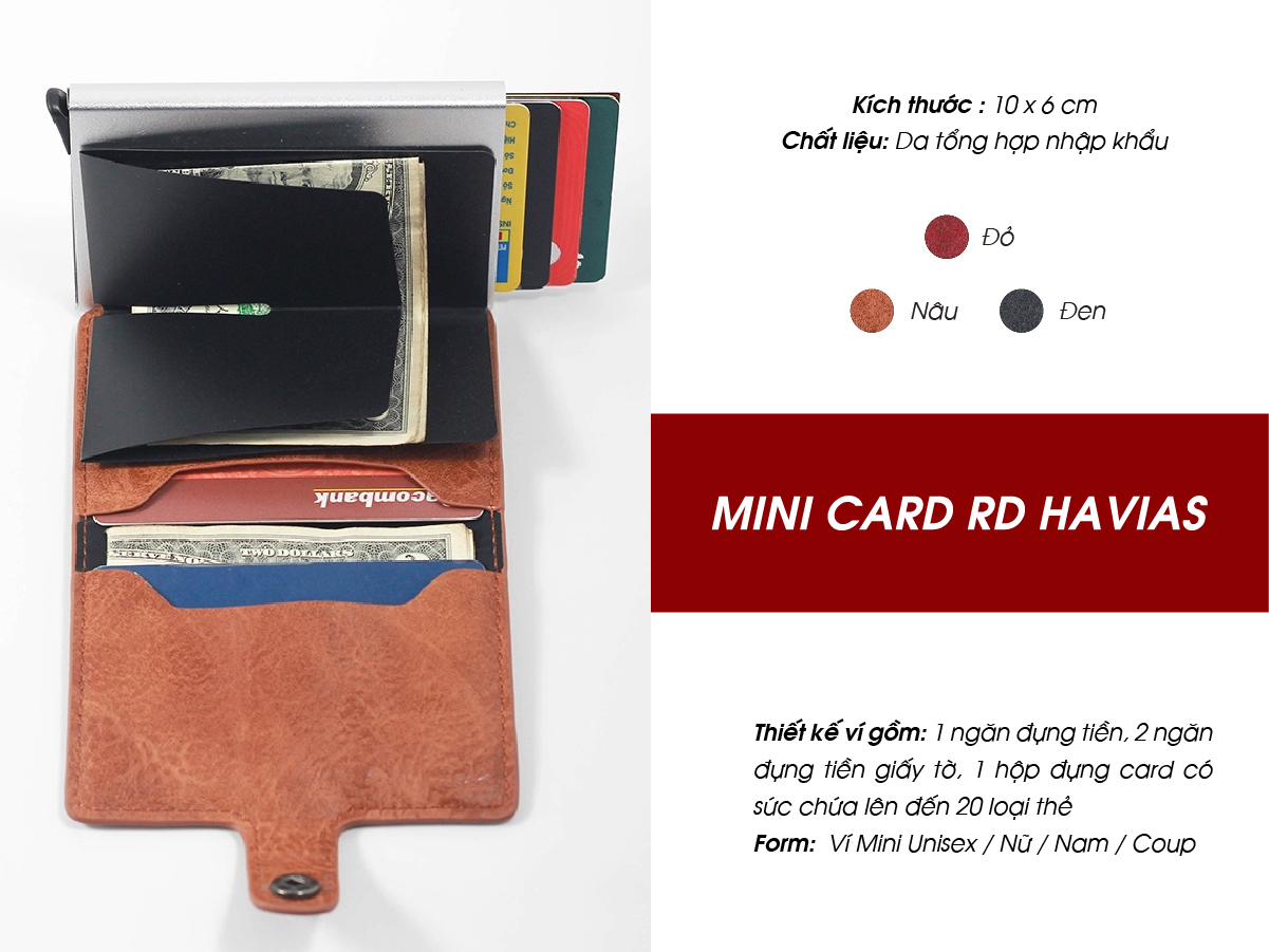 Ví Mini Hộp Card RD HAVIAS được lấy thiết kế từ 2 dòng ví card classic và dòng ví card thông minh hiện đại. Có sức chứa lên đến gần 20 chiếc thẻ tín dụng, ví Card RD HAVIAS có thể giúp bạn đựng không chỉ là thẻ mà còn cả giấy dạng card, card visit, tiền mặt nữa.